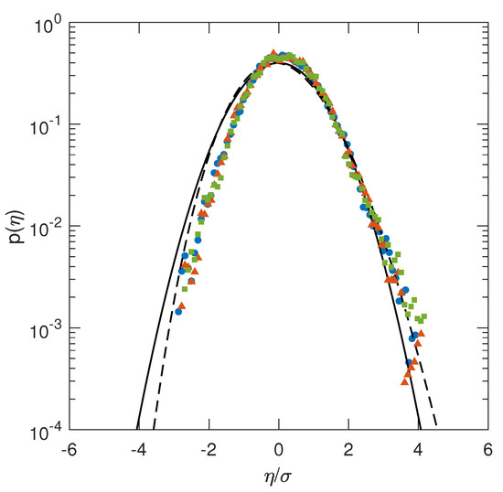 Figure 10 shows the probabilities of the wave elevations captured in the near field for the three wave spectra considered. These wave elevations correspond to the sea state captured at 23 peak wavelengths from the wave maker in the far field. For the sake of comparison, all wave elevations are normalized by their standard deviation . In addition, the normal probability density function and its second-order correction, computed along the lines of Tayfun [37], are shown. From Figure 10, all realizations appear to be skewed with respect to the Gaussian. The positive surface elevations evidently conform closest to the Tayfun distribution. However, the negative values overestimate the values expected for typically second-order waves. Furthermore, not much can be said regarding the differences between the spectra.