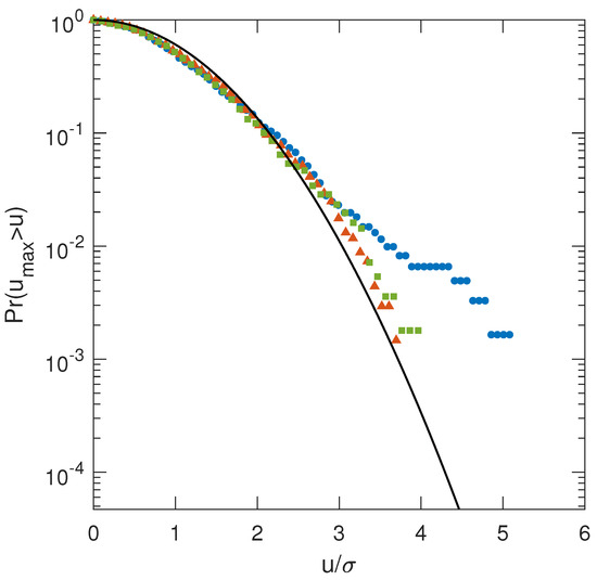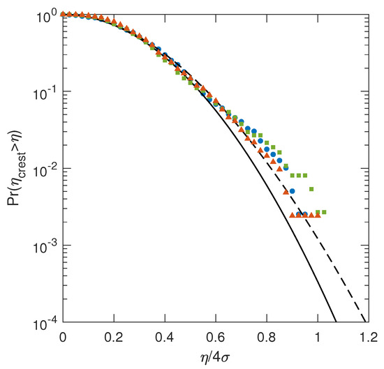 In Figure 11, the probability distributions for the wave crests are shown. The thresholds have been normalized by their wave height, i.e., . For comparison, the Rayleigh distribution, to which wave crests for linear waves tend, are drawn together with the Tayfun distribution for second-order wave crests. As expected, the wave crests resulting from all three wave specra conform best to the Tayfun distribution. Depending on the bandedness of the spectra, differences in wave crest distribution can be noted as well. For the largest BFI, corresponding to the narrow-banded case, strongest deviations from the Tayfun distribution can be noted. Overall, the statistics presented in Figure 11 are in strong agreement with the works by Onorato et al. [36] and Toffoli et al. [7].