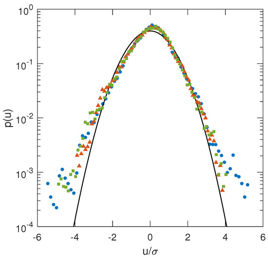 Probability density function tower top displacements with respect to the displacements normalized by their standard deviations, as computed by near-field time domain for BFI = 0.09 (•), BFI = 0.58 (▲) and BFI = 0.73 (■) plotted against the normal pdf (–).