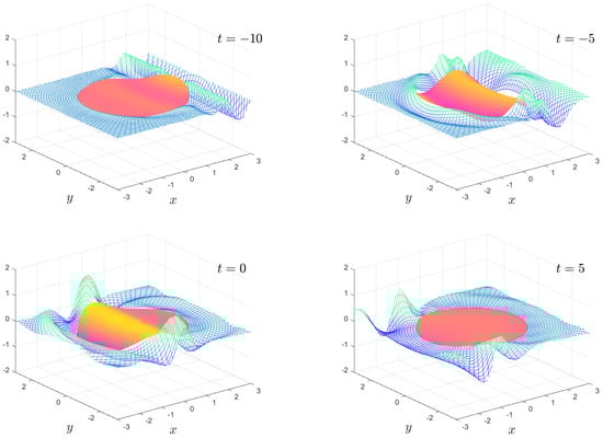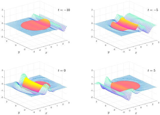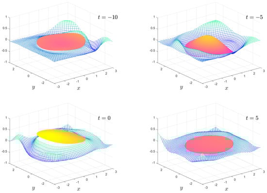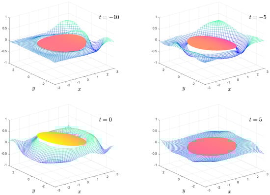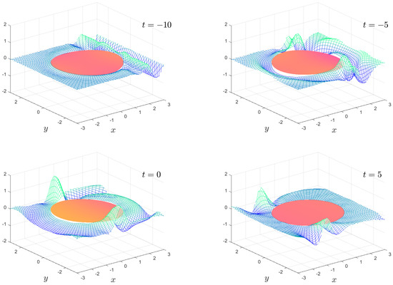 The numerical results we present are a subset of the possible motions which are possible. We fix the mass , the water depth and the floe radius for all calculations. The solution is shown as an animation in movies 1 to 8, which are given as Supplementary Material. Figure 2, Figure 3, Figure 4 and Figure 5 show snapshots from movies 1 to 4, respectively, for the times . We change the stiffness from in Figure 2 to in Figure 5. The plate goes from being virtually stiff to highly flexible. The complex motion of the plate and fluid systems can be seen, especially in the movies in the Supplementary Material.