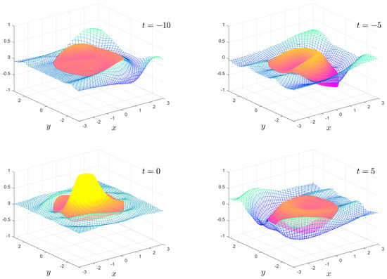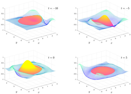 The time-dependent motion , , and for the times shown. The full animation can be found in movie 5.