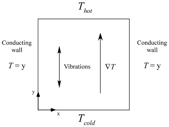 In keeping with a large portion of the work outlined in the introduction for standard RB convection, a simple 2D square cavity is considered. Microgravity conditions are assumed (no steady gravity). The direction of the temperature gradient and vibrations as well as the wall boundary conditions can be seen in Figure 1.