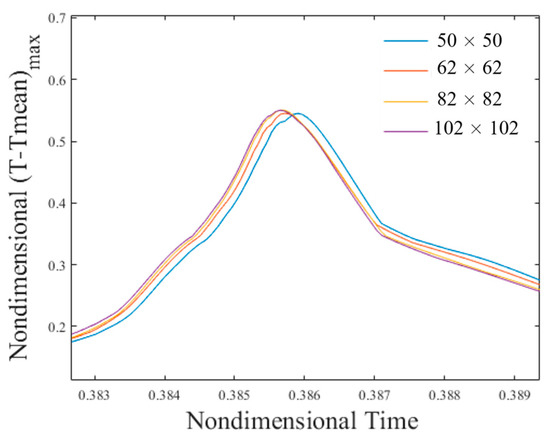 To verify the consistency of this way of thinking with the standard approach generally used to define a suitable mesh (i.e., a ‘classical grid refinement study’), we have increased progressively the number of computational nodes until convergence has been obtained. The outcomes of such a study are presented in Figure 3, where the maximum of the difference between the instantaneous temperature and the corresponding time-averaged (over the period of vibrations) value has been plotted (the so-called thermofluid-dynamic distortion). It can be seen that the results for a grid of size 82 × 82 are extremely close to that of the grid size 102 × 102, which implicitly indicates that (toward the end to save computational time) one may limit to considering the former coarser mesh. However, in order to meet all the possible criteria described before (see Table 1), we have decided to use the 102 × 102 mesh for all the cases considered in the present work.