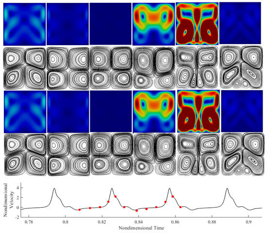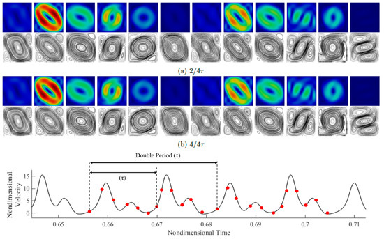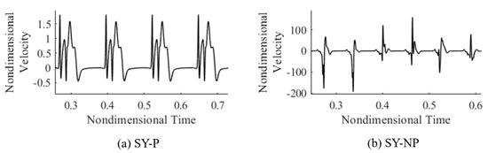 Before starting to deal with the detailed discussion of these results, we wish to anticipate that although the regimes (SY, SU, NP, and ST) were sufficient to compartmentalize the flow in the range of parameters considered by Hirata et al. [31], additional classes of flow have been identified for the cases simulated here in the interval (105 < < 106). These new findings have implicitly led to the need to introduce a distinction within the synchronous regime whereby a flow may be synchronous and periodic or synchronous and non-periodic (SY-P or SY-NP). Relevant examples of such new solutions are shown in Figure 5a,b, respectively. In particular, Figure 5a relates to the circumstances where the velocity signal is identical over each period for all periods (therefore, the signal can be considered synchronous and periodic). By contrast, although the signal shown in Figure 5b is still synchronous in time with the applied forcing (i.e., the vibrations), it also exhibits turbulent busts every period; moreover, the signal is not periodic, as the bursts display a more or less erratic evolution in time.