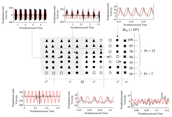 In addition to enlightening the reader on the complexity and unpredictability of the flow regime (with the exception of extremely high values of Ω for which the dynamics reduce to the emergence of a quiescent thermally diffusive state), this map provides a picturesque description of the velocity signals and the fluid behavior.