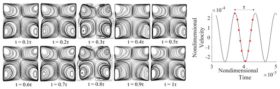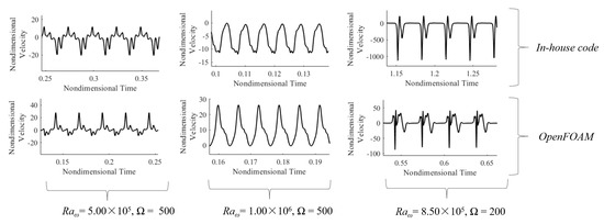 Before numerical results can be interpreted, it is imperative that the strategy for the solution of the governing equations is validated against available relevant benchmarks. Given our specific target, the earlier study by Hirata et al. [31] is specifically considered for such a purpose. In particular, three cases are chosen: (a) Ω = 200, = 7 × 104, (b) Ω = 500, = 105, and (c) Ω = 200, = 105 (the velocity signals for these cases are readily available to the reader in the original study, making the comparison with the current results straightforward). As the reader will realize by inspecting Figure 2, the present results are in excellent agreement with the original signals reported by Hirata et al. [31], both in shape and periodicity.