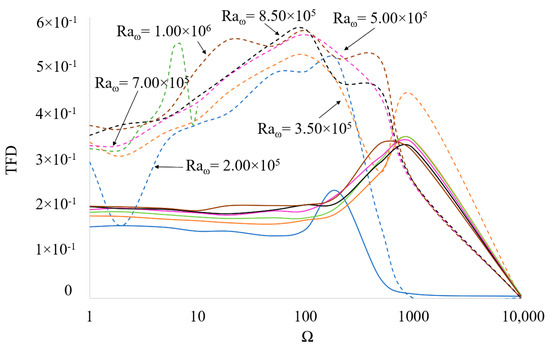The main outcome of the present parametric investigation, i.e., the extended map, is presented in Figure 6. It is divided into regions where clusters of convective modes can be observed. Although stabilization is achieved at extremely high frequencies (Ω = 104), the predominant flow regime apparent for high vibrational Rayleigh numbers ( > 5 × 105) is the aforementioned SY-NP case denoted by