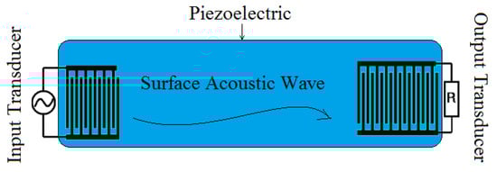 Top view of a typical of surface acoustic wave device, including input transducer, output transducer, and piezoelectric subtrace in a design.