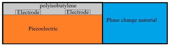 The PCM box has the size of . Figure 1 and Figure 2 uses the color for different things. The figures are not related, and they represent same thing. Figure 1 is schematic of general device, including many cells, and Figure 2 is the real geometry modeled here, including piezoelectric cell and added fluid cell through the material. As we consider Figure 1 as ideal schematics, then, in the Figure 2, one can see the interaction of the heat and electrical fields are working in one cell. As the name of the components is presented, the mechanisms of the system or the effects of phase change material will be explained in the next section.