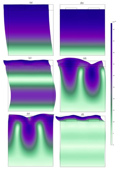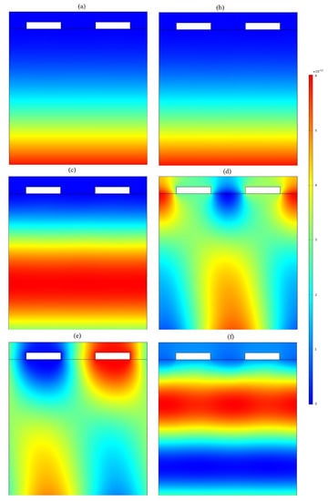 Electric potential: (a) mode 1, (b) mode 2, (c) mode 3, (d) mode 4, (e) mode 5, (f) mode 6.