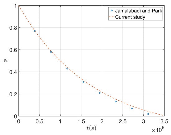The finite element method is used to solve problem. The relaxation factors for the velocity components, pressure correction, thermal energy, and liquid fraction were 0.5, 0.3, 1, and 0.9, respectively. To benchmark the problem, previous work of Jamalabadi and Park [] is used. Jamalabadi and Park [] applied the well-known software FLUENT to simulate the problem of melting in square cavity. The cavity of fluid at the right of the electric part is filled with nanofluid that is a mixture of an inorganic hydrated salt TH29 PCM [] and solid copper nanoparticles. The TH29 is made by an inorganic PCM composed primarily of calcium chloride hexahydrate(CaCl26H2O). With different left and top wall temperatures, an unsteady buoyancy-driven convective flow accompanying with phase change is formed in the cavity. Three particle volume fractions are considered. The associated thermophysical properties of PCM, nanoparticle and nanofluid are given in Table 1 and Table 2 (for more details, see []). As seen in Figure 6, both methods are in a good agreement, and little difference is caused by considering the Brownian effect in Jamalabadi and Park []. The used finite element method is compared to another paper (from the same author) that uses FLUENT, and it shows the validity of method in fluid part, as well.