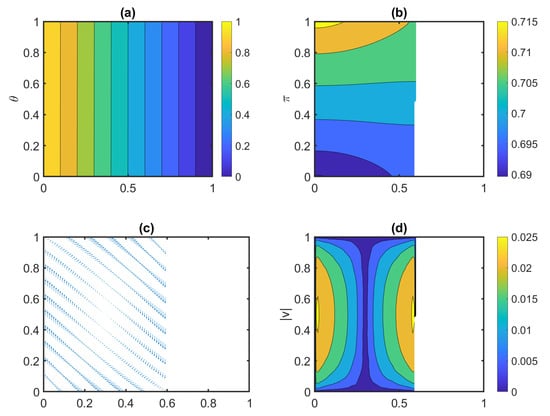 Initial condition of phase change material (PCM) cell: (a) contours of dimensionless temperature, (b) contours of dimensionless pressure, (c) velocity vector, (d) contours of velocity magnitude.