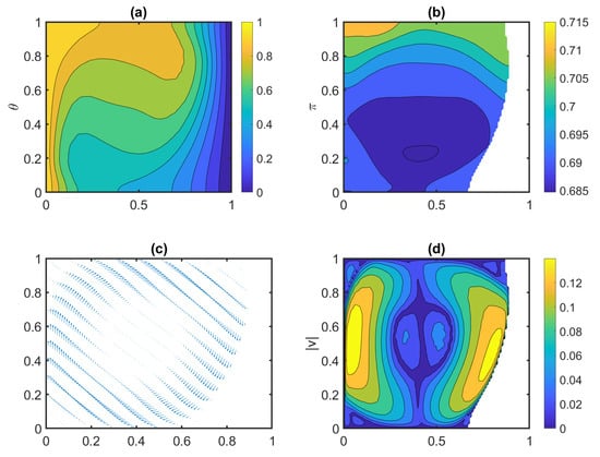 Final condition of PCM cell: (a) contours of dimensionless temperature, (b) contours of dimensionless pressure, (c) velocity vector, (d) contours of velocity magnitude.