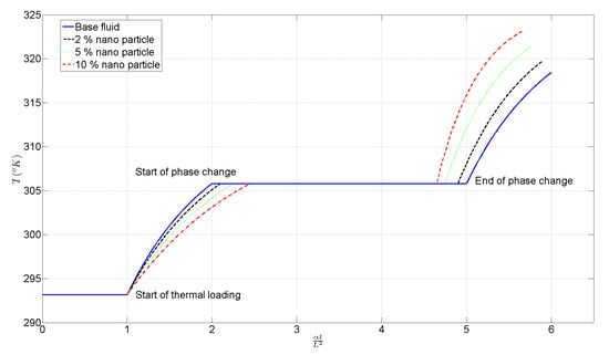 Time dependency of maximum temperature is plotted in Figure 11. The boundary conditions are all constant as a function of time (steady state) such that a steady state final condition should be achievable if the system was cooled. Here, a final condition is not reachable as the system will simply continuously heat up. It would seem that the advantage of using a PCM is its ability to efficiently manage temporary spikes in temperature caused by a transient input. As stated in the abstract, the results show that the NEPCM causes heat transfer improvement up to . This is a comparison with a PCM in the absence of nanoparticles, and PCM with  of nanoparticles.