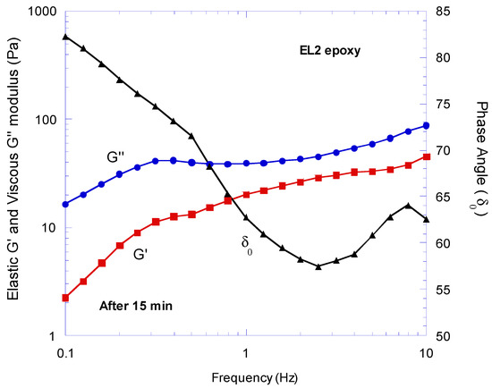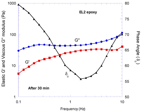 The shear strain value used for carrying out the experiment on the EL2 synthetic epoxy was set to 1% as per the LVER test result since this value is within the material’s linear viscoelastic region. Therefore, the material’s viscoelastic behaviour was evaluated within its non-destructive deformation range. Figure 3, Figure 4 and Figure 5 illustrate the evaluation of the viscoelastic properties of the synthetic EL2 epoxy at different times after the hardener mixing with the epoxy. In each graph, it can be noticed that the G″ (viscous component) was always the predominate viscoelastic modulus compared to the G′ (elastic components). This behaviour was observed at high and low frequencies and at different time points after mixing the epoxy with the hardener. Thus, EL2 is a liquid-like viscoelastic material. This hypothesis was confirmed by the shift angle δ values obtained, which in each experiment were always within the 45–90° range (area of variation characteristic of a liquid-like viscoelastic material). This behaviour can also be confirmed by the fact that the epoxy was tested within its pot-life limit and therefore before its gel time, which is when a thermoset resin system converts from a liquid mixture to a solid material that has a highly cross-linked polymer.