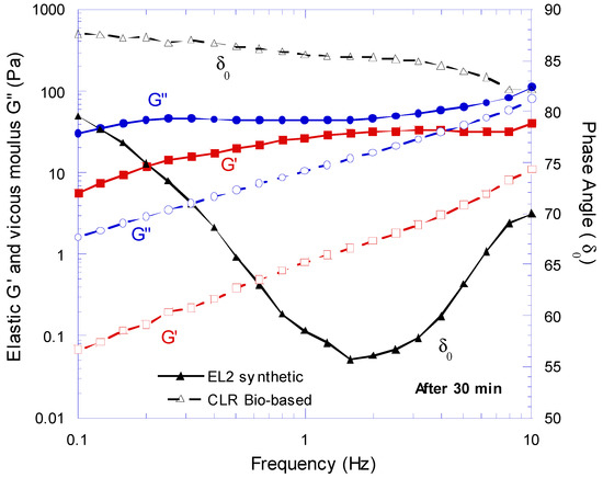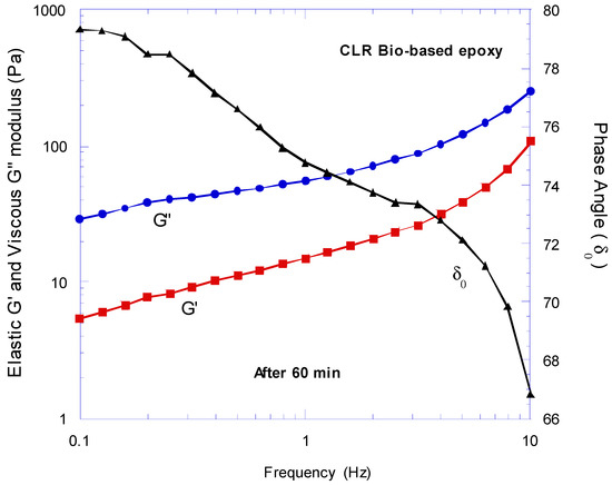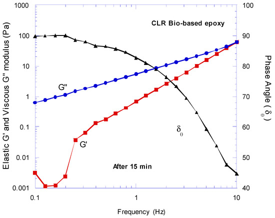 The results of frequency sweep for both epoxies are compared in Figure 9, Figure 10 and Figure 11. It can be seen that after 15 min of mixing (Figure 9), the EL2 synthetic epoxy showed a more significant G′ and G″ compared to the CLR bio-based epoxy at high and low frequencies, whereas for both resins the G″ was predominate to G′, and their phase angle was between 45° and 90°. Therefore, they were in the viscoelastic liquid region. However, due to the cross-linking process, the structure of both epoxies became more stable with time. For instance, the curves of the 60 min mixing (Figure 11) compared with the one after 15 min mixing (Figure 9) seemed to be more balanced and “smoother”, since no sudden modulus behaviour alteration was observed. The change in microstructure had an important consequence in the viscoelastic behaviour of both epoxies. After 60 min of mixing (Figure 11), the G′ (which measures the elastic component) and G″ (which measures the plastic component) values of CLR bio-based epoxy were predominant compared to the viscoelastic parameters of the EL2 synthetic epoxy at high and low frequencies. Therefore, due to the cross-linking process, the bio-resin gained a more significant shear modulus compared to the synthetic epoxy. Thus, the bio-based epoxy showed a better ability to resist deformation in the longer period compared to the synthetic epoxy.