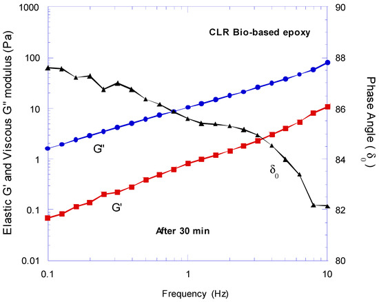 Figure 6 , Figure 7 and Figure 8 illustrate the evaluation of the viscoelasticity properties of the CLR bio-based epoxy at different frequencies. Similar to the synthetic epoxy, the bio-based epoxy showed a liquid-like behaviour in each individual test performed, due to its phase angle, δ, values. In this case, we also noticed that the G″ was predominant compared to the G′ at low and high frequencies and at different times after mixing the hardener with the epoxy. This behaviour was because these experiments were carried out within the pot-life limit of the epoxy.
