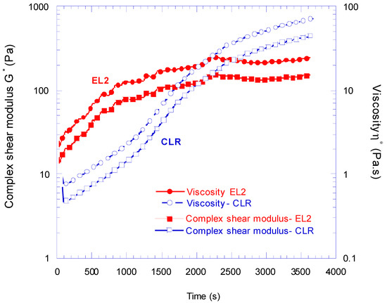 Variation of complex modulus (G*) and complex viscosity (η*) of CLR bio-based and EL2 synthetic epoxies after 60 min of mixing with hardeners.