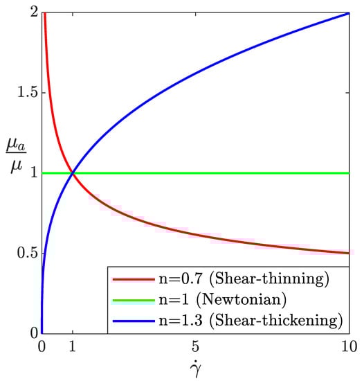 For shear-thinning fluids (), the apparent viscosity decreases with increasing shear rate, while the opposite effect occurs for shear-thickening fluids (). In this study, is not limited by a minimum or a maximum value. For Newtonian fluids (), the shear rate does not influence the apparent viscosity, which leads to . Figure 1 illustrates the dependency of the normalized apparent viscosity on the shear rate for the power-law indexes 0.7, 1, and 1.3, which are used in this study.