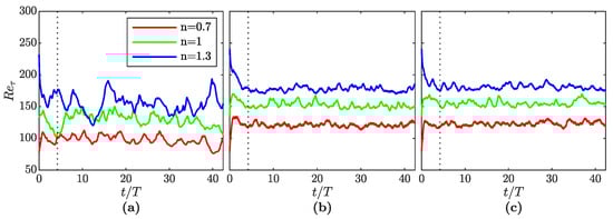 Typically, the convergence of bubble-laden channel flows towards a statistically steady state is measured using the average wall shear stress [,]. By normalizing it with , can be expressed in terms of the friction Reynolds number . Figure 4 shows , based on the wall-averaged shear stress , for all setups as a function of the time. The starting time of statistical averaging is illustrated by the dotted line at . As explained in Section 3.2, all cases are initialized from a single-phase channel flow of a Newtonian fluid controlled by a constant pressure gradient corresponding to . This value can be observed at for the three cases corresponding to . While of the single-phase case continues to fluctuate around this theoretical value when the flow control is changed to a constant volumetric flow rate, the presence of the dispersed gas fraction increases the average wall shear stress by approximately 20%. This effect was already reported in [], where the authors attributed it to the stirring of the bubbles, which affects the near wall region above a certain gas fraction. The observed increase is 19.5% for and 21.7% for . Although the time-averaged wall shear stress of the single-phase setup for deviates from the theoretical value by less than 2%, the respective fluctuations are found to be stronger compared to the two-phase cases. The presence of the bubbles has a clearly visible dampening effect on the fluctuations of , irrespective of the power-law index.