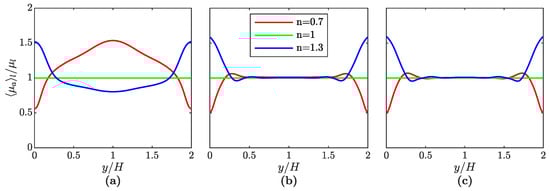 Since the three cases in each setup category, i.e., single-phase or two-phase with either quasi-spherical or deformable bubbles, are identical apart from the different power-law indexes, it is expedient to initially investigate the viscosity statistics of each case. The viscosity values do not only explain the above-mentioned observations regarding the average wall shear stress, but they are also responsible for all other differences occurring in the results of one setup category. Figure 5 shows the average apparent dynamic viscosity of the liquid phase , normalized with the viscosity for , as a function of the wall-normal coordinate y.