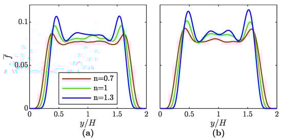 When comparing the void fraction profiles for the cases with to the profiles with a non-Newtonian liquid phase, clear tendencies can be observed. First of all, the bubble-free zone near the walls is wider for the shear-thickening and narrower for the shear-thinning setup. As a consequence, the profiles for are shifted towards the channel center. Since the overall gas fraction is identical for all cases, this results in a stronger accumulation of bubbles in the core of the channel. Therefore, both the peaks in the transition between core and walls as well as the plateau-like section in the center are shifted to higher values. The opposite holds for , where the bubbles are distributed more uniformly along the wall-normal direction. The shear lift force occurs due to the mean flow gradient near the wall. As the boundary layer becomes thinner (thicker) for shear-thinning (shear-thickening) fluids (see Figure 7), the bubbles move closer to (stay away further from) the wall compared to the Newtonian case. However, the peaks do not only increase for higher values of n. A comparison of the profiles for and reveals that, independent of the power-law index, the profiles are also shifted towards the channel center for increased . This impacts the peaks in the same way as described for increased values of n.