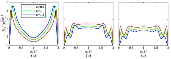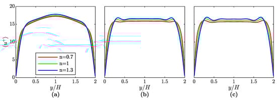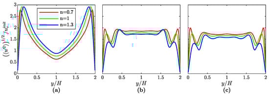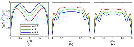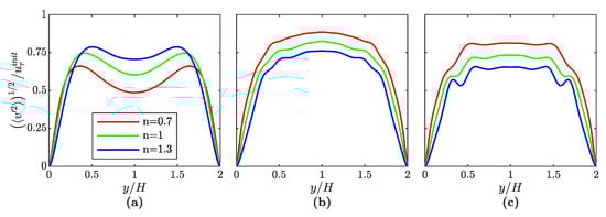 Figure 9, Figure 10 and Figure 11 show the root mean square of the stream-wise, the wall-normal and the span-wise velocity fluctuations, normalized by the friction velocity of the initialization case . Overall, the fluctuations for strongly resemble the profiles reported in the literature [,,]. The introduction of a dispersed phase at a significant void fraction leads to clear deviations of all profiles from their single-phase counterparts. The stream-wise velocity fluctuations for the single-phase setups, illustrated in Figure 9, reach their maximum close to the wall, followed by a decrease towards the channel center. Independent of the power-law index, the opposite behavior can be observed for the two-phase setups. Figure 9 shows that, although the first peaks of the bubble-laden flows are located at the same values of y, they are significantly lower. This indicates a strong turbulent intensity reduction in the near-wall region. As discussed in [], the reason for this observation might be that, due to their lower velocity compared to the liquid bulk, the bubbles act as obstacles and intermit the otherwise present turbulence structures. On the other hand, compared to the single-phase setups, the two-phase flows reveal increasing fluctuations of the stream-wise velocity component in the channel core, which are generated by the high number of bubbles present in this region []. As can be seen, the stream-wise fluctuations are virtually independent of y in the bubble-rich core, where the bubbles are distributed evenly (see Figure 6).