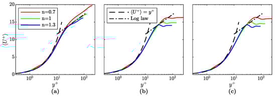 Semilogarithmic plot of the average stream-wise velocity, normalized by the actual friction velocity to yield , as a function of the dimensionless distance from the wall for the single-phase (a) and the two-phase setups with (b) and (c).