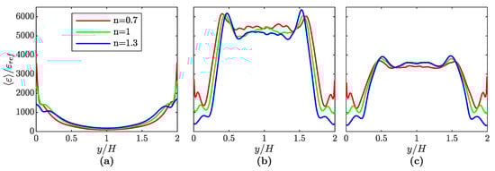 For the three single-phase setups, the dissipation rate reaches its maximum at the walls, while the minimum is located in the channel center. In the near-wall region, the dissipation rate decreases with increasing power-law index. However, the order reverses at a distance of approximately from the walls. This behavior can be deduced from the fluctuations of the three velocity components (see Figure 9, Figure 10 and Figure 11), where similar trends can be observed. It is worth noting that viscosity plays a role as well, but the velocity fluctuation gradients have a quadratic contribution to the dissipation rate. The two-phase setups are dominated by the presence of the bubbles in the core of the channel. Since (see Section 3.2), the kinematic viscosity of the gas phase is significantly higher than the apparent kinematic viscosity of the liquid phase. For the Newtonian fluid, is 10. As a consequence, there is a direct relation between the void fraction (see Figure 6) and the dissipation rate profiles (see Figure 12) and the corresponding profiles exhibit a very similar shape. The two-phase profiles do not only deviate from their single-phase counterparts in the center of the channel, but also close to the walls. This reflects the significant deviations of the two-phase velocity fluctuation profiles from their single-phase counterparts, occurring for practically all values of y (see Figure 9, Figure 10 and Figure 11).