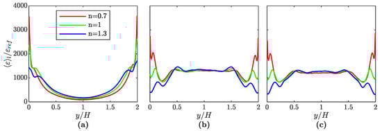 In order to exclude the effect the high kinematic viscosity of the bubbles has on the dissipation rate, Figure 14 provides the average normalized dissipation rate conditioned on the liquid phase . The profiles have not been averaged over the two channel halves. The single-phase profiles, given for comparison, are identical to those shown in Figure 12. As observed for , the presence of the bubbles completely changes the profiles for all power-law indexes. In the near-wall region, the two-phase cases for and exhibit significantly lower dissipation rates compared to the single-phase flow. For , this observation only holds true directly at the wall. At larger distances from the wall and especially in the core of the channel, the bubbles significantly increase the liquid phase dissipation rate irrespective of the power-law index. For , the dissipation rate in the channel center is approximately as high as its peak value in the near-wall region. It is especially interesting to note that, for the shear-thickening fluid, the presence of the bubbles completely reverses the trends resulting for the single-phase setups. The minimum dissipation rate can be observed at the walls. The highest dissipation rates occur from to in the form of a plateau-like section. This behavior can partly be attributed to the apparent viscosity in the channel core, which, compared to the corresponding single-phase flow, reaches higher values for the bubbly flow setups at (see Figure 5). Moreover, we refer to the relation between k and explained above. Compared to the single-phase flows, including the bubbles significantly lowers the values of k close to the walls (see Figure 13), in particular for . Together with the higher turbulent kinetic energy in the channel core, which can be observed irrespective of n, this explains the two-phase profiles of the dissipation rate at , shown in Figure 14.