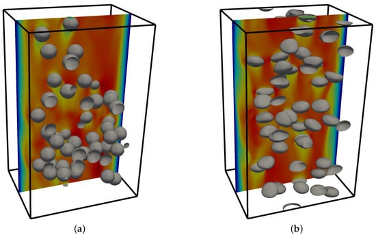 While the three single-phase setups, one for each power-law index, are primarily considered for comparison purposes, the main interest lies in the six two-phase setups. These are investigated at a total gas volume fraction of 6%, which is achieved by including 72 bubbles with an identical initial diameter of . The simulation is initialized by inserting them into the velocity field of a fully developed single-phase channel flow using a uniformly distributed (x,y,z)-array of (6 × 3 × 4). To study the interplay of bubble deformability and power-law behavior of the liquid bulk, two different Eötvös numbers, , are considered. For the three setups with quasi-spherical bubbles, the surface tension coefficient is set in a way that the Eötvös number is . Furthermore, the gravitational acceleration g is chosen such that, for the two-phase setups with the Newtonian fluid, the Galilei number has a value of . This completes the set of material properties, which is selected to make the setup comparable to the pioneering study of Lu and Tryggvason []. Apart from the fact that the setups in their work are controlled by a constant pressure gradient instead of a constant volumetric flow rate, their case with the highest gas fraction is identical to one of the cases presented in this work ( and ). The higher Eötvös number of is achieved by decreasing the surface tension coefficient. Together with the other dimensionless numbers provided, this fully defines the investigated setup. For completeness, the values of the single parameters are given in Table A1 (Appendix A).