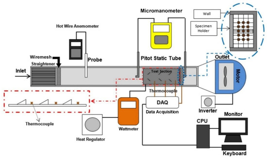Detailed analysis of the effect of vortex dynamic on heat transfer improvement in this study was carried out by numerical simulation. In this study, experiments were also carried out to validate the numerical simulation results, as shown in Figure 1. This experiment was carried out in the mechanical engineering thermofluid laboratory of Diponegoro University. The channel for testing was made of glass with a thickness of 1 cm and a length, width, and height of 370 cm, 8 cm, and 18 cm, respectively. Air was sucked into the channel by a blower located at the end of the channel through a straightener with wire mesh behind, which functions to uniform the flow. Air velocity in the channel was varied in the range 0.4 m/s to 2.0 m/s with 0.2 m/s intervals. This air velocity was measured by a hot wire anemometer (Lutron type AM-4204 with an accuracy of ±0.1 m/s), which is located 27 cm behind the wire mesh. An inverter (Mitsubishi Electric-type FR-D700 with an accuracy of ±0.01) was used to regulate the flow velocity by controlling the blower’s motor to obtain the desired flow velocity. Then, the flow passed through a plate (1 mm thick with length and width of 500 mm and 155 mm, respectively), which was heated constantly by a heater with/without VG. A test plate without VG attachment was termed the baseline. The constant heat induced into the plate was monitored by a wattmeter (Lutron DW-6060 with an accuracy of ±1.0) with a heating regulator setting. Several type K thermocouples were used to measure the inlet, outlet, and surface temperatures of the test plate. These thermocouples were connected to data acquisition (Advantech type USB-4718 with an accuracy of ±0.001) and linked to the CPU for monitoring and storage. The pressure drop between the inlet and outlet points of the test plate was measured by two pitot tubes connected to a micromanometer (Fluke type 922 with an accuracy ±0.05).