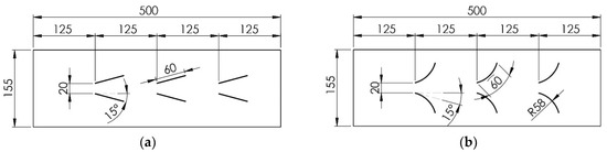 In this study, the VG used were concave rectangular winglet (CRW) and rectangular winglet (RW) arranged in common flow-down with an angle of attack of 15°. VG was made of the aluminum plate at a thickness of 1 mm with/without holes having a diameter of 5 mm. The dimensions and geometry of the CRW and RW VGs are shown in Figure 2. The longitudinal pitch distance between VGs is 125 mm, and the transverse pitch distance between a pair of VGs is 20 mm. Figure 3 illustrates a top view of the test plate with VGs. The detailed geometry of VG is presented in Table 1.