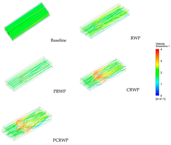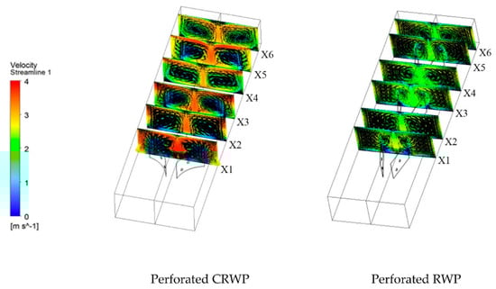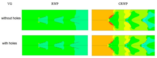 Figure 10 shows the pressure distribution in the area streamwise in a channel mounted with VG for the flow velocity of 2.0 m/s. The installation of VG in the channel obstructs airflow, which impacts on increasing pressure drop due to the formed drag in the flow [26]. Figure 10 shows that CRWP VG results in a greater pressure drop than that of RWP VG because the frontal area of CRWP VG is larger than that of RWP VG. In addition, the holes in VG reduce pressure drop because jet flow removes stagnant fluid in the downstream region of VG, reducing the pressure difference before and after VG [23].