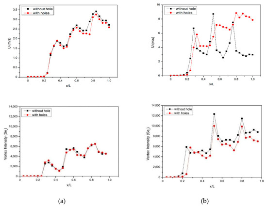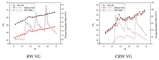 Figure 11 shows the comparison of the mean spanwise Nusselt numbers and energy dissipation rate in the RW and CRW VG cases with or without holes at a flow velocity of 2.0 m/s. From Figure 11, it can be observed that the mean spanwise Nusselt and energy dissipation rate in the use of CRW VG is higher than that of RW VG due to the higher intensity of LV in the case of CRW VG, as illustrated in Figure 8. The holes in VG slightly reduce the strength of the LV, resulting in a decrease in the mean spanwise Nusselt number and energy dissipation rate, as observed in Figure 11. The highest average spanwise Nusselt numbers in the case of RW and CRW VG without holes at flow velocity are 5.58 at x/L = 0.32 and 0.61 at x/L = 0.38, respectively.