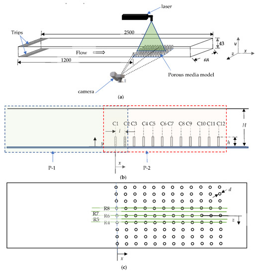 The model test channel used in this work was built from 6 mm thick transparent acrylic plates glued together in a closed channel with the internal dimensions of 2500 mm (length) × 69 mm (width) × 43 mm (depth, H). The channel consisted of a flow entry section and a downstream section with a compact porous model. For the flow entry section, fourteen equally spaced out 3.18 mm square rods were glued on the first 90 mm portion of both upper and lower walls of the entrance of the channel. These served as trips to assure the rapid development of the turbulent boundary layer. The compact porous model in the test section was assembled by mounting transparent acrylic rods into a square array of holes drilled into the lower wall. The rods were of nominal diameter d = 3.18 mm and average height h = 9.06 mm. With 12 rows and nine columns of such an array of rods spaced out equally at distance l = 7.19 mm between adjacent rod centers, a porous model of porosity 85%, and of filling fraction h/H = 21% was achieved. This model is much more compact than previous related studies [7,25,31]. Based on the density and submergence classification parameter provided in the review by Nepf [35], the current arrangement had a submergence ratio H/h of 4.78 and frontal area density dh/l2 of 0.56, which may be classified as a (transitionally) dense canopy of shallow submergence. The salient geometric features of the porous model are summarized in Table 1. A schematic diagram of the test channel highlighting the porous model is also shown in Figure 1. In this figure, the Cartesian coordinate system used in this work is also identified. It should be noted that the origin of the streamwise axis x (i.e., x = 0) was fixed at the center of the most upstream column of rods. Thus, a 1200 mm length of flow entry was allowed before reaching the model porous medium (Figure 1a). The origins of the wall-normal direction y (i.e., y = 0) and the spanwise direction (i.e., z = 0) were also respectively located at the lower wall and the middle of the channel span. The model test channel was assembled into the transport channel so that the midspans of both channels were fixed and coincident at z = 0.
