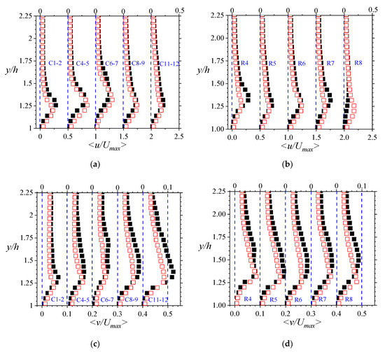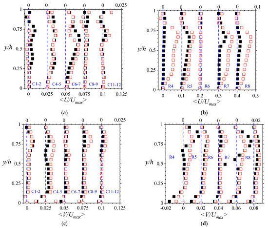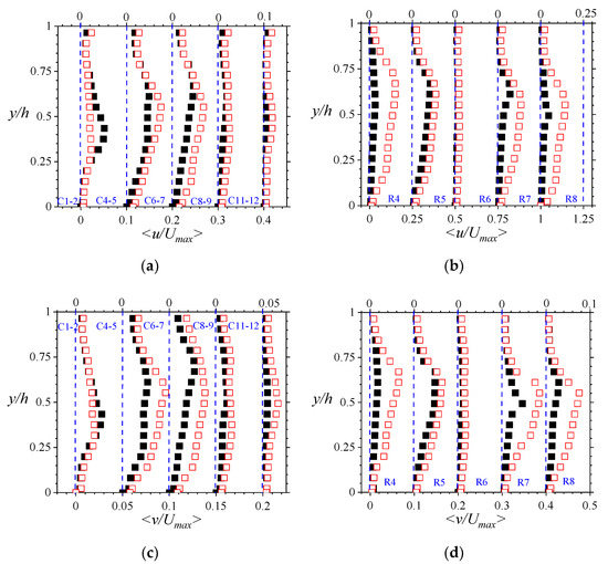 Parameters <U/Umax> and <V/Umax> are respectively line-averaged streamwise and wall-normal components of the mean velocity normalized by the maximum localline-averaged streamwise mean velocity in both open and porous regions. Here, the profiles for the flow within the porous medium are shown. Staggered plots (a,c) show the streamwise variations whereas (b,d) demonstrate the spanwise variations. The denominations C and R respectively stand for columns and rows, and are illustrated in Figure 1. Black-filled boxes are the results for Test A, and red-open boxes are the results for Test B.