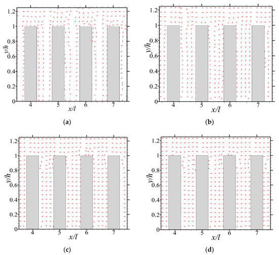Vector plots for the selected rods at (a) z = 0 in Test A; (b) z = 0 in Test B; (c) z = l in Test B; (d) z = −l in Test B. Note that for each plot, gray-filled boxes indicate locations of porous medium rods. Vectors have also been skipped to maintain clarity.