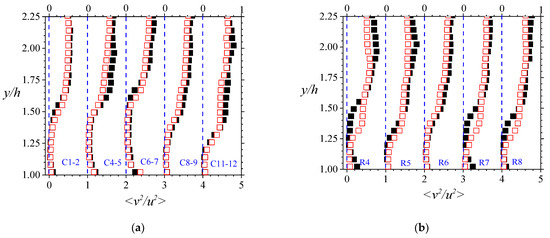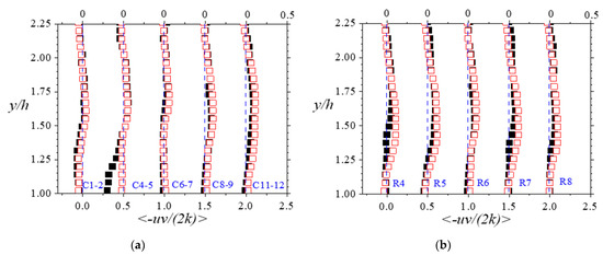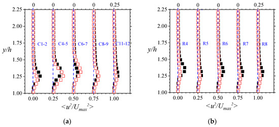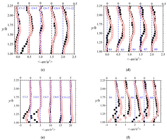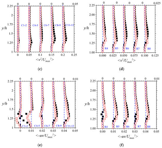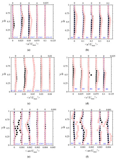 Turbulence quantities <u2/Umax2>, <v2/Umax2>, and <−uv/Umax2> are respectively line-averaged streamwise Reynolds normal stress, wall-normal Reynolds normal stress, and Reynolds shear stress in the streamwise-wall-normal plane, normalized by the maximum local line-averaged streamwise mean velocity in both open and porous regions. Here, the profiles for the flow within the porous medium are shown. Staggered plots (a,c,e) show the streamwise variations whereas (b,d,f) demonstrate the spanwise variations. The denominations C and R respectively stand for columns and rows, and are illustrated in Figure 1. Black-filled boxes are the results for Test A, and red-open boxes are the results for Test B.