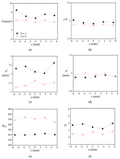 Spanwise variation of (a) boundary layer thickness; (b) location of the edge of the boundary layer (y/h values at 0.99<Umax>); (c) displacement thickness; (d) momentum thickness; (e) Reynolds number based on momentum thickness and maximum velocity; and (f) shape parameter. Note that the legend showed in (a) applies to (b–f).