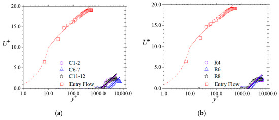 Mean streamwise line-averaged velocity profiles in inner coordinates for selected Test B conditions. Plots in (a) show streamwise variations compared with entry flow. Plots in (b) show spanwise variations compared with entry flow. The solid red line represents log law (Equation (2)). The red dashed line represents the law of the wall U+ = y+. Other solid lines represent modified log law for rough walls (Equation (3)). The denominations C and R respectively stand for columns and rows, and are illustrated in Figure 1. Black-filled boxes are the results for Test A, and red-open boxes are the results for Test B.