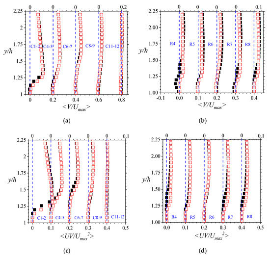 Turbulence quantities <V/Umax>, and <UV/Umax2> are respectively line-averaged mean wall-normal velocity, and momentum flux, normalized by the local maximum line-averaged streamwise mean velocity in open and porous regions. Here, the profiles for the flow in the open region are shown. Staggered plots (a,c) show the streamwise variations whereas (b,d) demonstrate the spanwise variations. The denominations C and R respectively stand for columns and rows, and are illustrated in Figure 1. Black-filled boxes are the results for Test A, and red-open boxes are for results for Test B.