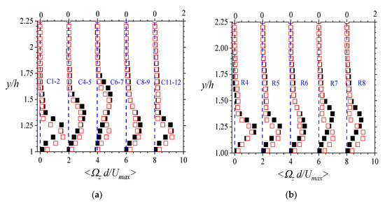 Line-averaged mean spanwise vorticity <Ωz > = <∂V/∂x − ∂U/∂y> plots normalized by the ratio of the local maximum line-averaged streamwise mean velocity and rod diameter. Plots in (a) are staggered distributions along the stream, and those in (b) are staggered across the span in the open region. The denominations C and R respectively stand for columns and rows, and are illustrated in Figure 1. Black-filled boxes are the results for Test A, and red-open boxes are the results for Test B.