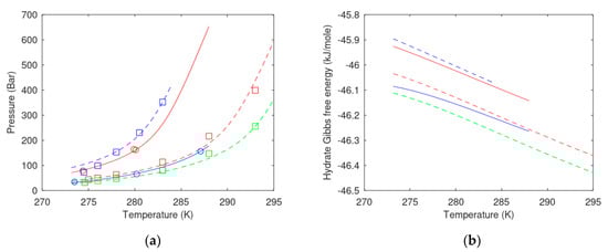 (a) Temperature pressure stability limits for CH4 hydrate formed from CH4 and water containing MEG (circles are experimental data [38] and solid curves are calculated) or TEG (squares are experimental data [39] and dashed curves are calculated). Blue curves and circles are for 10 wt% MEG in water. Red circles and curve are for 30 wt% MEG. Green squares and dashed curve are for 10 wt% TEG. Red squares and dashed curve are for 20 wt% TEG and blue squares and dashed curve are for 40 wt% TEG. (b) Gibbs free energy for hydrates formed along the stability curves in Figure 1a. Same line notations as in Figure 1a.