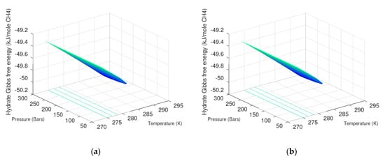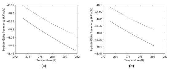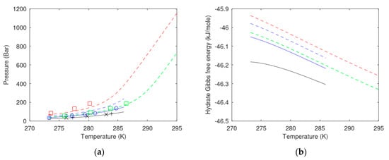 For the heterogeneous hydrate formation, the phase index p in Equation (7) is gas. is the fugacity coefficient for CH4. In this work I utilize the Soave–Redlich–Kwong (SRK) equation of state [14]. The first term on the right-hand side is the ideal gas chemical potential as function of temperature and density. Ideal gas chemical potential is trivial to calculate using the momentum space of the canonical partition function. The methane model is a sphere and the methane ideal gas chemical potential is easy to calculate. The analytical expression can be found in any textbook on physical chemistry. Guest molecules with rotational degrees of freedom also require the moments of inertia for the rotational degrees of freedom ideal gas chemical potential. In this work, all models are rigid and there are no ideal gas contributions from intramolecular degrees of freedom. The second term is the ideal gas mixing terms that comes from the entropy of mixing ideal gas components at constant pressure.