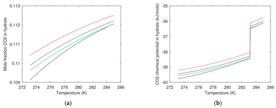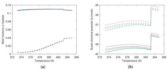 Composition of the hydrate is plotted in Figure 6a. Chemical potentials of the guests in the hydrate are plotted in Figure 6b. The values are reasonable in view of the influence of CO2 on chemical potential for N2 through the density of the mixture and the fugacity coefficient.