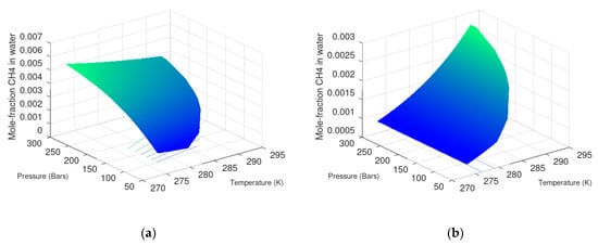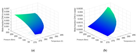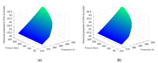 Since methane is pure in the first systems illustrated in Figure 1 and Figure 2 mole-fraction is unity. Equation (7) enters into Equation (6). The free energy change of inclusion for methane in small and large cavity is given elsewhere [9,13,26,44,45,46]. With Equation (5) in Equation (2) and solving Equation (2) equal to Equation (3) for the same chemical potential of water in liquid water as in the hydrate. Chemical potential for water in empty clathrate is also given by Kvamme and Tanaka [46]. I have solved the equations iteratively for pressures, with temperature as the chosen fixed variable. The chemical potential for the gas changes significantly with pressure. I therefore also plot the composition of the formed hydrate as well as chemical potential of CH4.