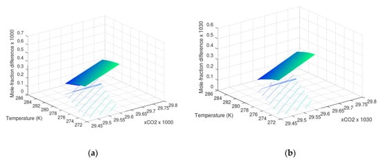 Hydrate growth potential in terms of mole-fraction, from solubility down to hydrate stability limit (z-axis), as function of solubility mole-fraction (x-axis) and temperature (y-axis) and pressure. For each temperature on the temperature axis, solubilities and growth potentials are calculated for pressures from 90 bar to 300 bar This is reflected in the increased solubility along the x-axis. (a) Pure water and (b) 3 mole% ethanol in water.