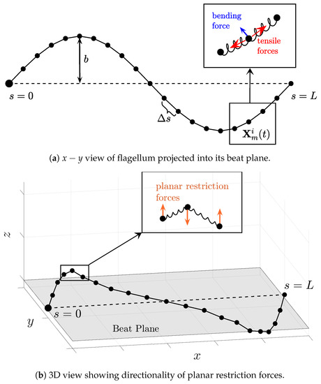 Because we will be simulating flagellar motion computationally, we discretize the spatial coordinates and the forces by evenly distributing points along the flagellum as depicted in Figure 2. Thus, we will be modeling the motion of each point (the point along the flagellum) that arises from discretized forces denoted by , which are derived from discretizing the energies in Equations (4)–(6) along each flagellum. Figure 2 is a schematic representing the forces derived from Equations (4)–(8) and what they mean in the 2D beat plane, as well as the forces out of the beat plane, resulting from Equation (6) specifically.