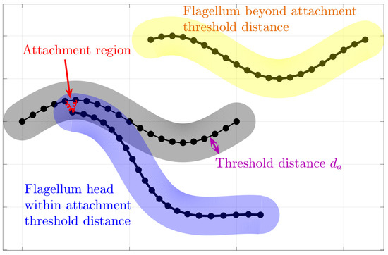 Note that this force is applied at the head (first point) of the flagellum m but also in equal magnitude but opposite direction at nearby points j along the neighboring flagellum n, so both flagella will be impacted by the attachment. Figure 3 shows a schematic of the attachment model.